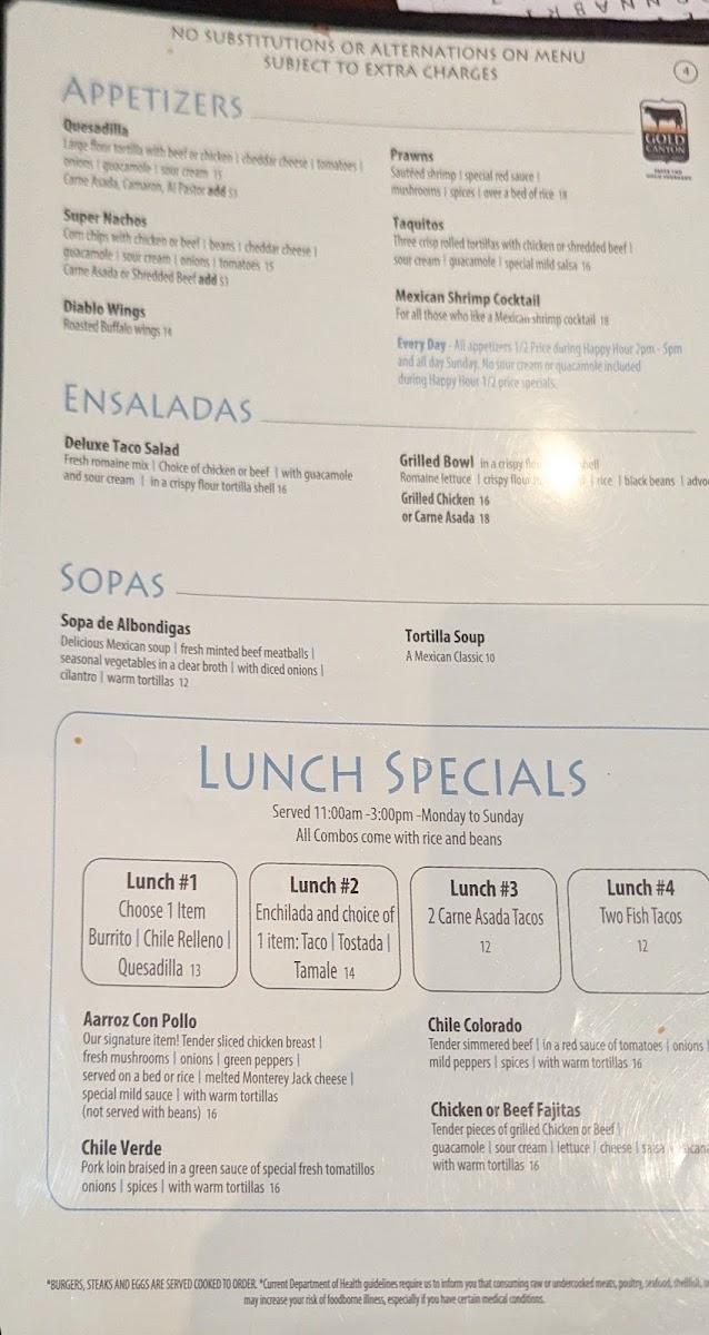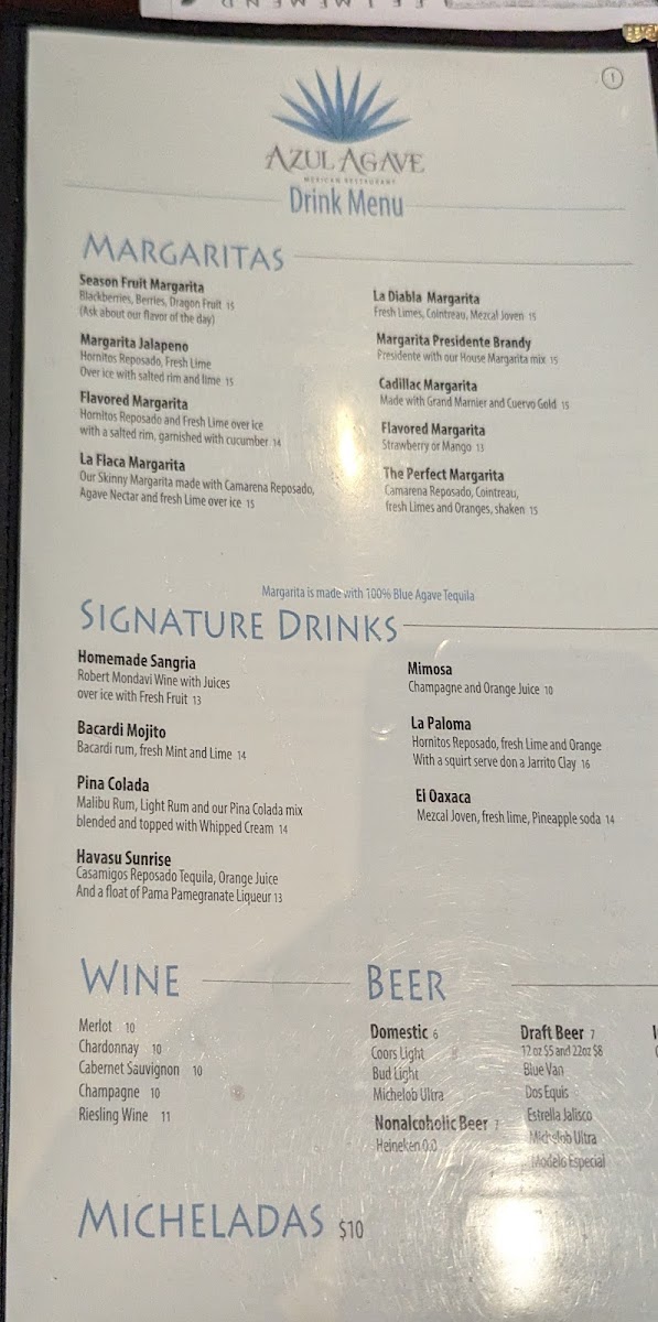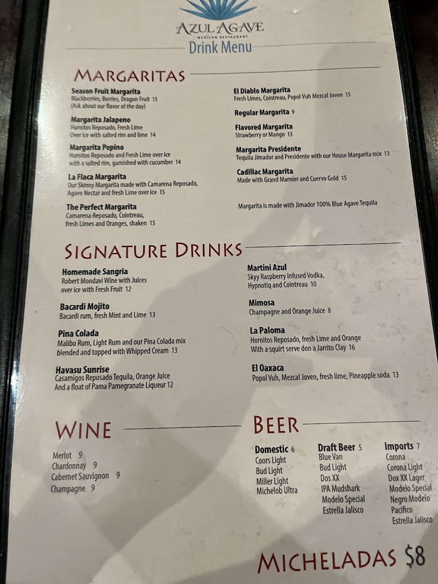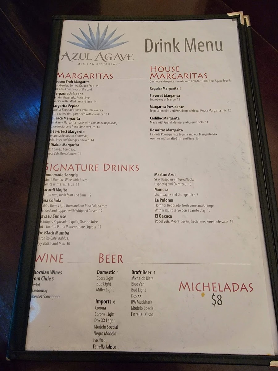 Step into a world of flavorful dishes at Azul Agave Menu, located at 1561 Palo Verde Blvd S in Lake Havasu City. Whether you're craving traditional Mexican cuisine or seeking something with a modern twist, this menu has something for everyone. From sizzling fajitas to perfectly crafted tacos, each dish is made with fresh ingredients and a touch of love. The vibrant flavors of the dishes will transport you straight to the heart of Mexico, with bold spices and unique combinations that will keep you coming back for more. Whether you’re here for a quick bite or a long, relaxed meal, you’ll find plenty to satisfy your cravings. The friendly atmosphere and the delicious variety of options make Azul Agave Menu the perfect choice for any occasion.